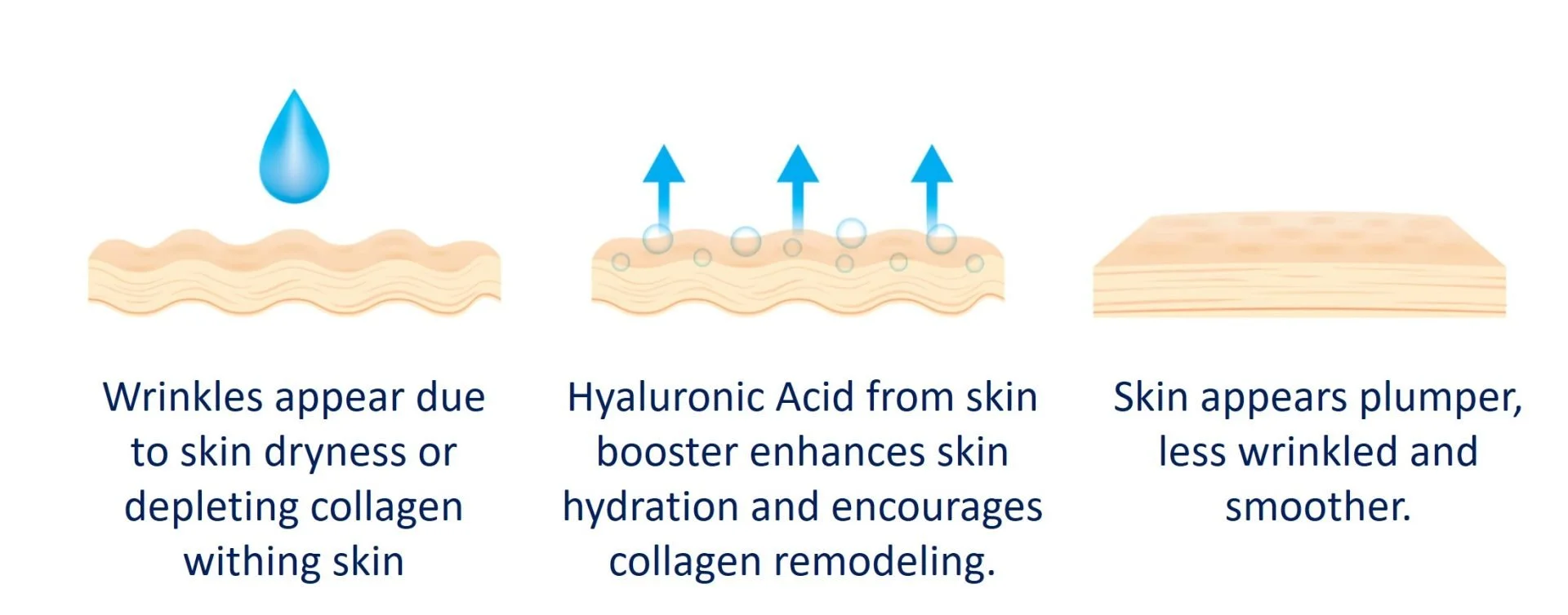Skin boosters are injected into target areas to deliver hydration directly to the skin layers.